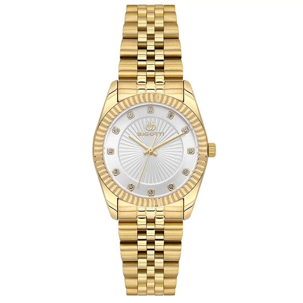 Kristályokkal díszített, arany tónusú női karóra, hullámmintás lünettával. Tökéletes viselet a hétköznapokra és különleges alkalmakra is.