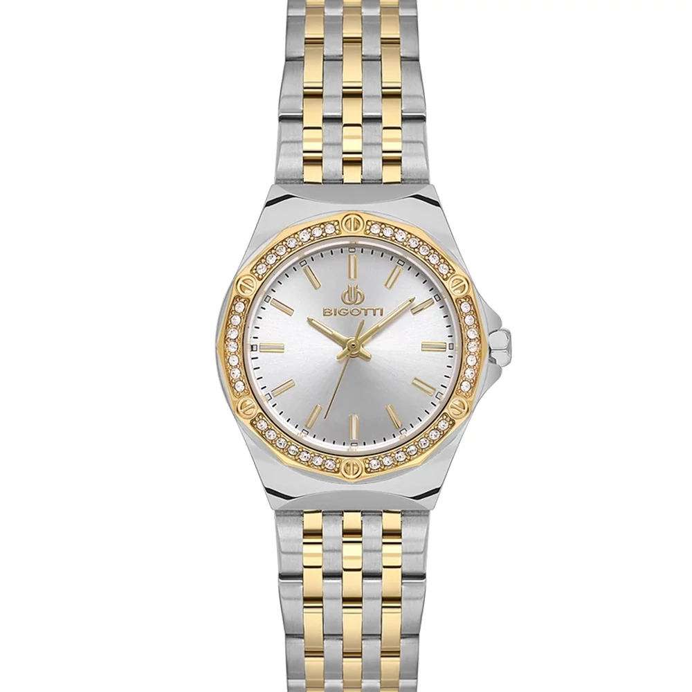 Kristályokkal díszített, rózsaarany-ezüst tónusú bicolor, női óra. Tökéletes viselet a hétköznapokra és különleges alkalmakra is.
