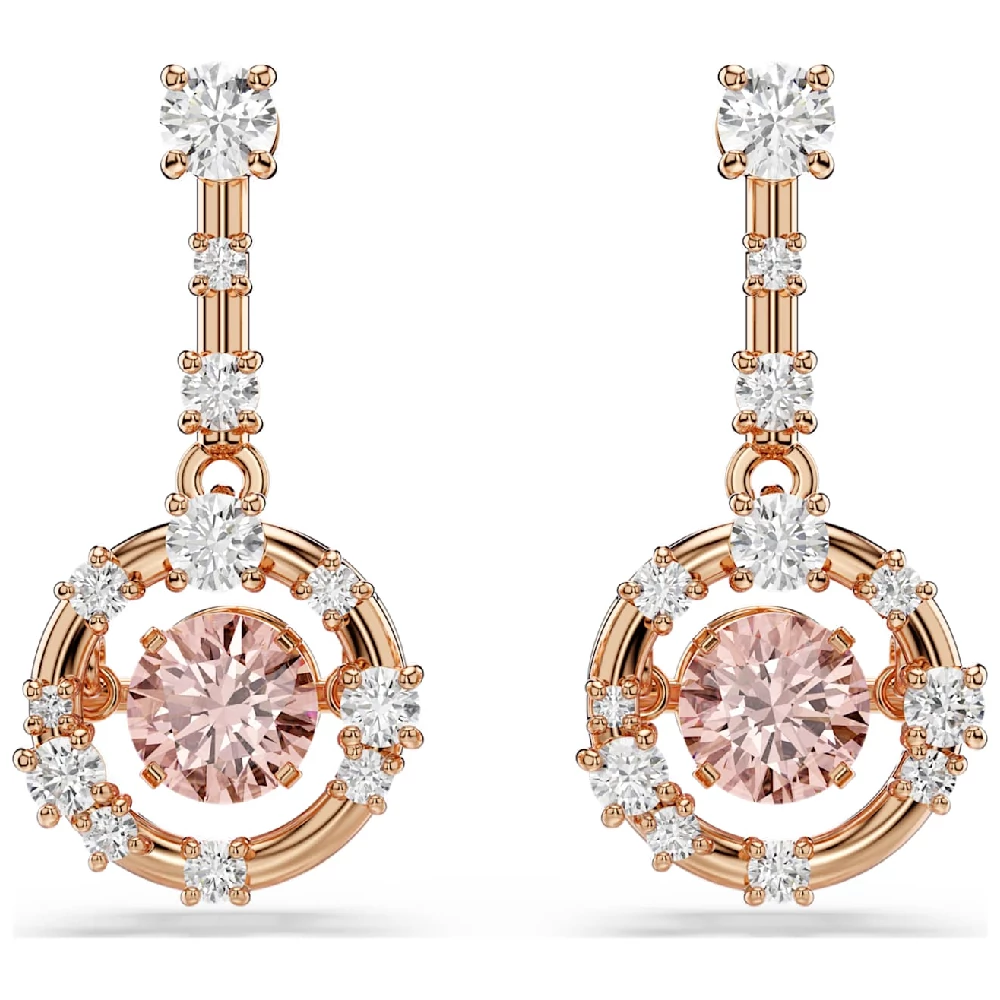 A maximális ragyogás jegyében készült, csillagok ihlette fülbevaló bármilyen öltözéket fényesen ragyogóvá varázsol. Mindkét rózsaarany tónusú bevonatú darab közepén egy rózsaszín mozgóköves kristály található, amely végtelen tükröződéseket hoz létre, a fémes keretek és rudak körül pedig kisebb Swarovski Zirconia kristályok helyezkednek el. Viselje a hozzáillő medállal, hogy megjelenése olyan ragyogó legyen, mint a csillagos égbolt.