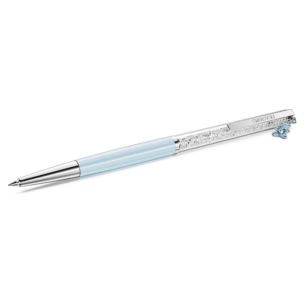 Ez a karcsú golyóstoll a határtalan kreativitás időtlen kiegészítője. A vékony kialakítású tollat körülbelül 400 átlátszó kristály díszíti, amelyek a hosszú, átlátszó ablakon keresztül láthatók. A világoskékre lakkozott tollszár mellett a toll krómbevonatú kivitellel, valamint egy kék mackós amulettel rendelkezik, amely a bizalmat és a tartós szeretetet szimbolizálja.