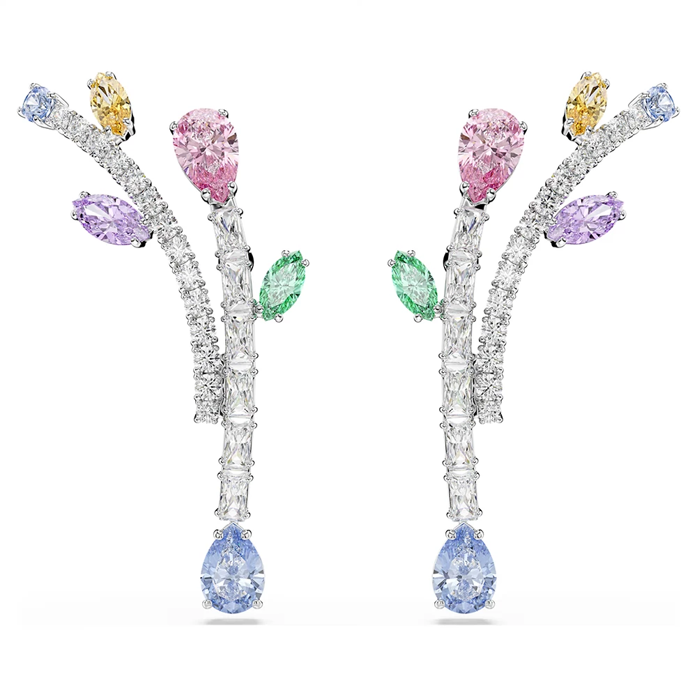 A Swarovski jellegzetes precizitásával készült, ródiumbevonatú fülbevalók a vidámság megtestesítői. A virágcsokrok szárait kerek és baguette metszésű, átlátszó Swarovski Zirconia kristályok díszítik, míg a különféle elegáns metszésű levelek pasztellszínekkel töltik meg az ékszert. Viselje ezeket a fülbevalókat a termékcsalád más darabjaival, így egy csipetnyi kreativitást csempészhet stílusába.